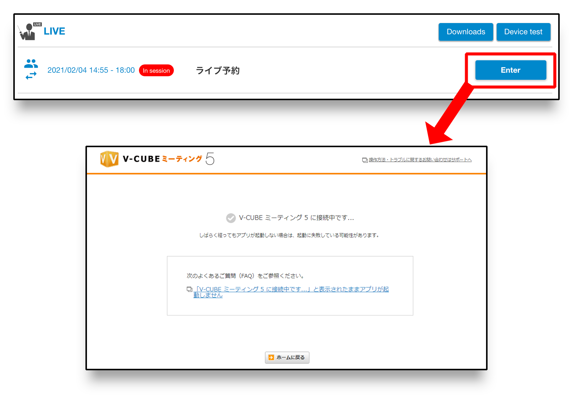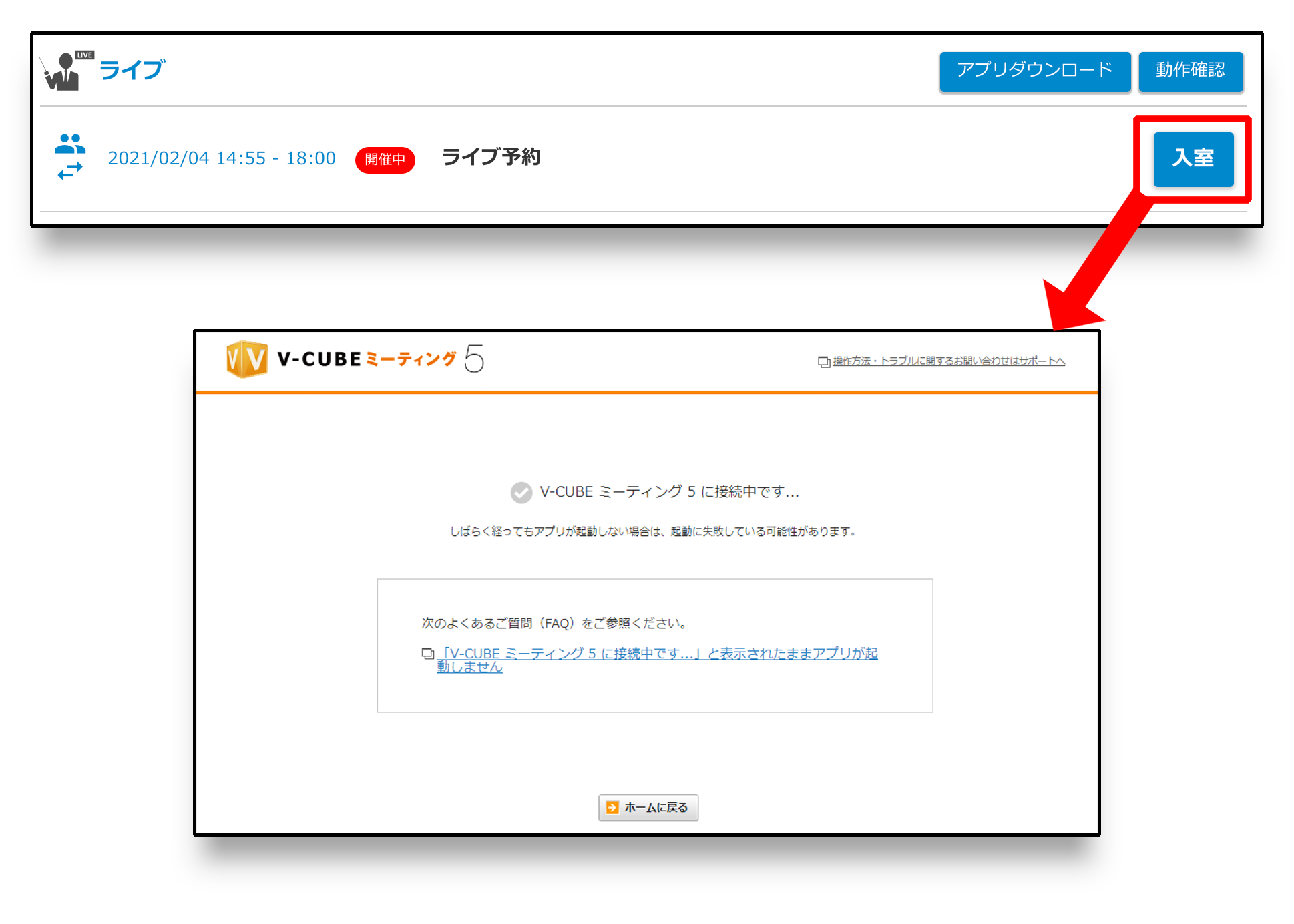 - ライブへの参加はTOP画面の「入室」ボタンよりお願いします。また、再入室する際も同様の手順でご入室ください。